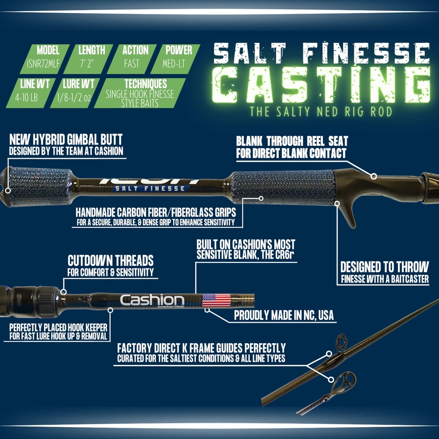 Built to take on some of the toughest fighting fish on the planet, the Cashion ICON Salt Finesse Casting Rod is specifically engineered to present downsized presentations to trophy-class targets. A true workhorse for saltwater BFS anglers, the Icon Salt Water Ned Rig Casting rod excels with single hook finesse presentations such as the popular Salty Ned or Sea Trout jigs. Like all Cashion models, the Ned Rig Casting rod in the ICON Salt Finesse series is proudly made in the USA using only premium quality components and the highest levels of craftsmanship.