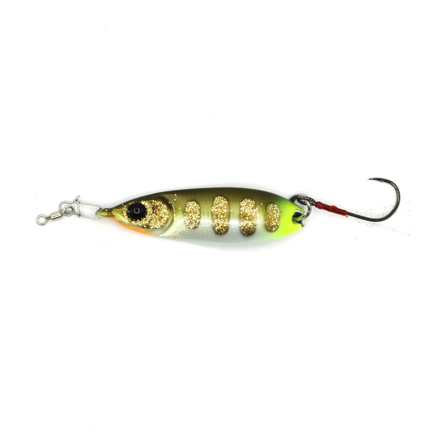 Designed primarily for black bass species, the Cosaji Spoon is equally effective when fishing for trout, panfish, or light saltwater predators. Fished with a horizontal cast and retrieve, the Cosaji Spoon mimics a weakened baitfish with its wide wobble and fluttering action. When fishing from docks, piers, kayaks, or boats, the Cosaji spoon can also be vertically jigged with a lift and drop motion to entice bites from suspended and deep water fish.