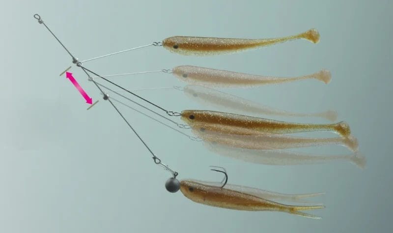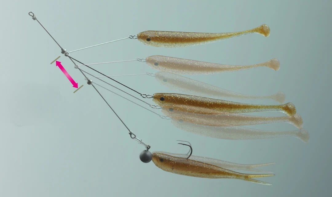 Jackall Peaceton is built around a strong central wire that ends with a soldered connection point for the clip and single jig head. The defining action comes from the free-sliding wire arms that allow the dummy baits to move differently from the main bait. With the hooked bait attached directly to the central wire, its movements are far more pronounced than those of the dummy bait, creating the illusion of a small fish separated from the school and triggering reactive feeding bites from the bass.