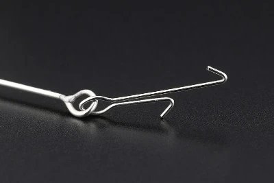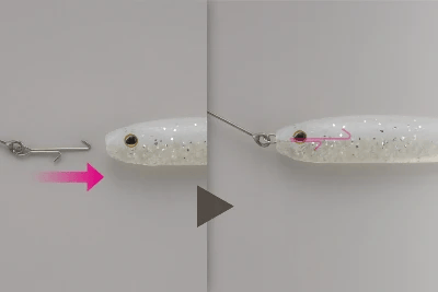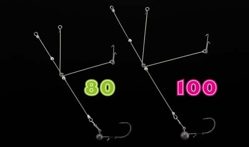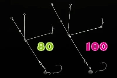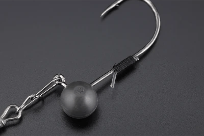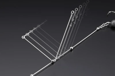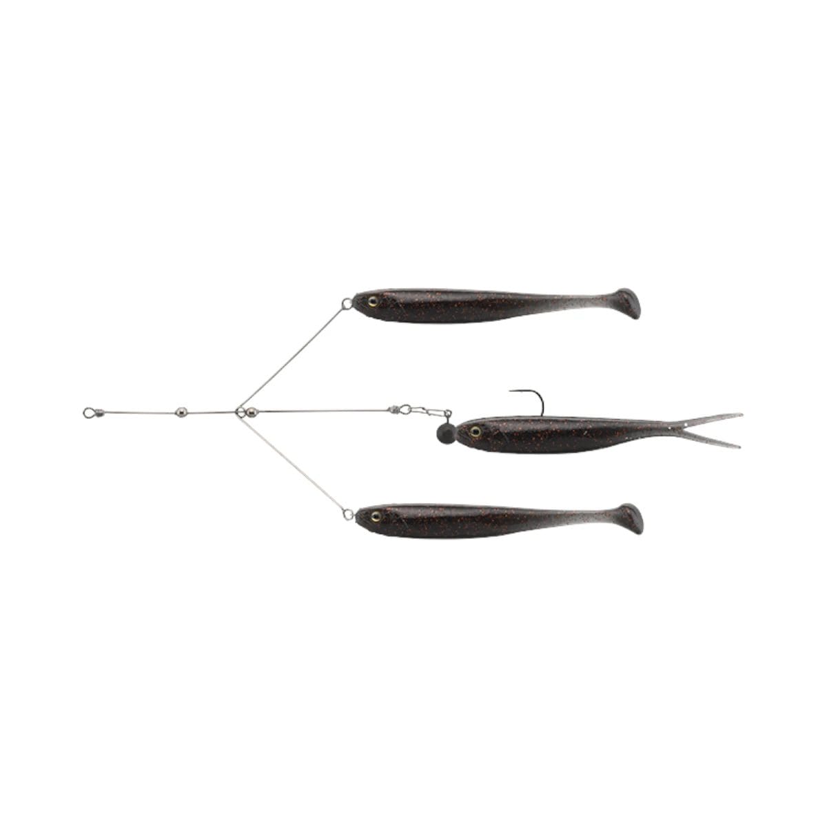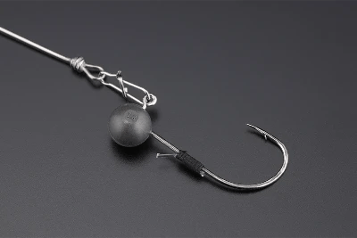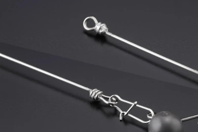 To secure the dummy baits to the rig, a double barbed wire keeper is used at both ends of the free-sliding wire. Slide the wire keeper into the nose of the bait to secure it in place. This design holds the baits firmly so that they do not tear off during intense fights.