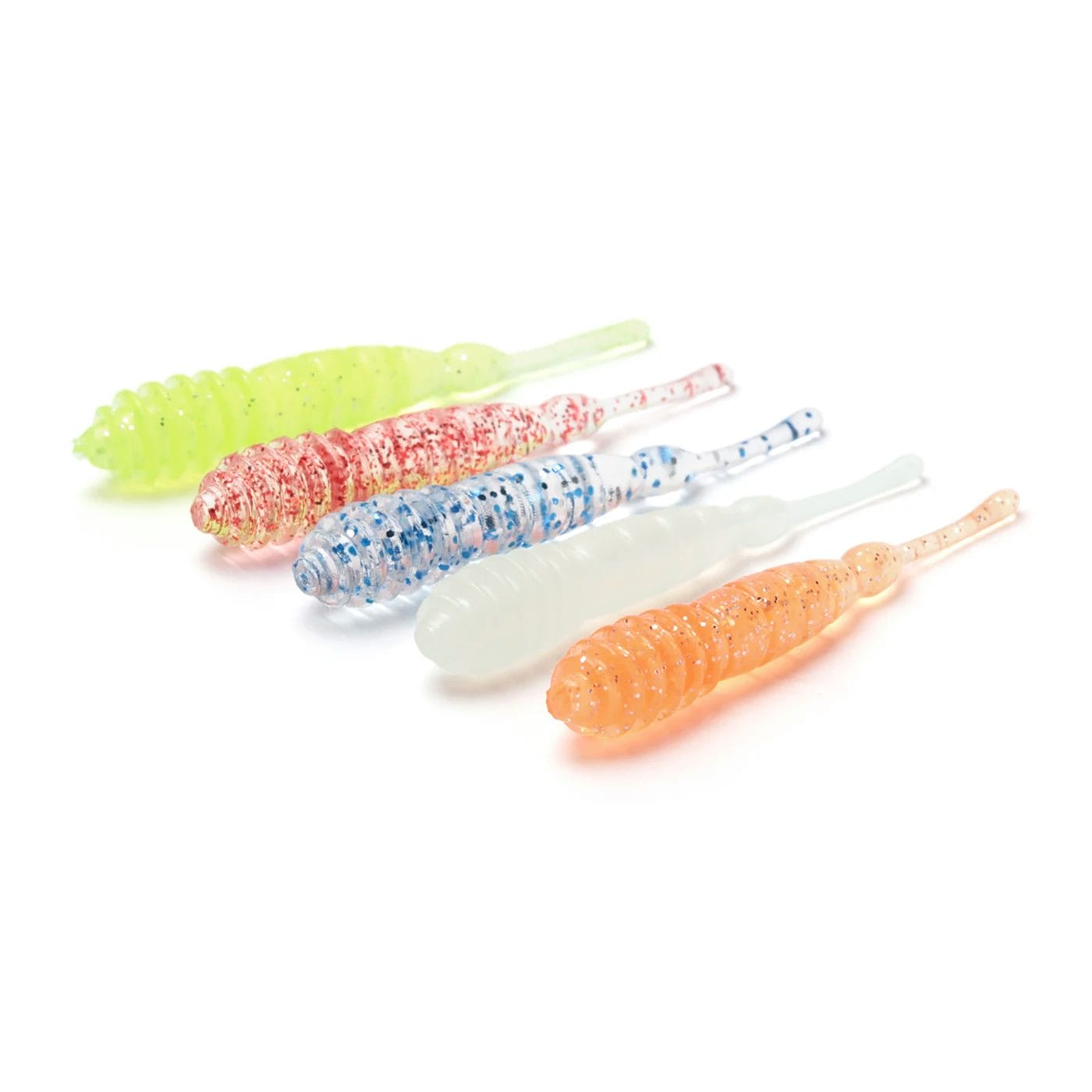 Jackson Pipi Ring is a small 1.6″ soft plastic worm that was developed using years of scientific data obtained from researching the feeding patterns and stomach content of species such as horse mackerel (aji) and rockfish (mebaru). The design of Pipi Ring is modeled after the shape, length, and diameter of polychaete (marine worms), the most common foods of these light game fish. With its ringed body, Pipi Ring sends out subtle vibrations as it swims through the water, attracting the attention of fish and triggering a feeding response. The thin tapered tail adds an additional layer of action as it subtly quivers in the current or with gentle rod movements. Intended for light saltwater species, Pipi Ring is impressively effective when jigged for trout, bluegill, or crappie.