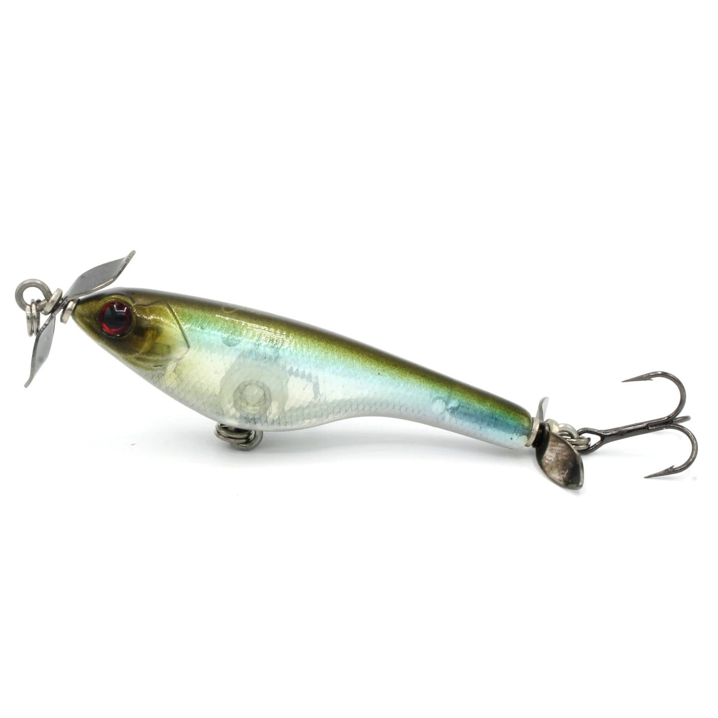 With a fall rate of approximately 1 foot per second, the Shinobi Shad can be effectively fished at various depths. Retrieved at a slow and steady pace, its alluring side-to-side shimmy produces bites in even the most pressured conditions. Equipped with oversized props produce brilliant flash and emit subtle vibrations through the water, calling in predators from even great distances. Finished with dangerously sharp VMC treble hooks that penetrate easily and offer superb holding power.