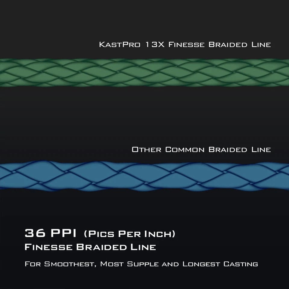 Kastking’s Kastpro 13X Finesse Braid is an ultra-thin, ultra-strong, and ultra-smooth braided line specifically for finesse fishing and designed for freshwater and saltwater. Offering superior knot strength and zero stretch, Kastpro 13X Finesse Braid allows for easy hooksets and extreme sensitivity. Constructed from high-quality UHMPE fibers, with a strength rating 10x that of steel fibers, Anglers can confidently fish the Kastpro 13X Finesse braided line in the harshest conditions.