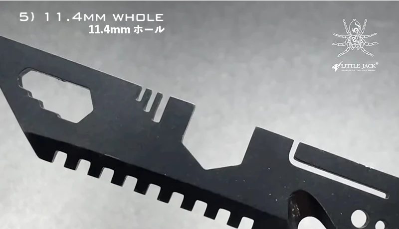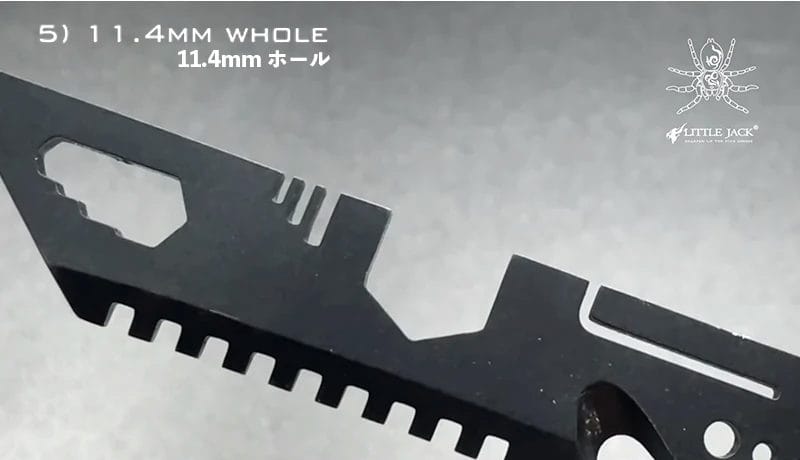 5) 11.4mm HOLE – A useful wrenching hole. 11.4mm wide, can be adjusted by inserting a coin to fill the gap on smaller bolts. Check out the image gallery for other uses.