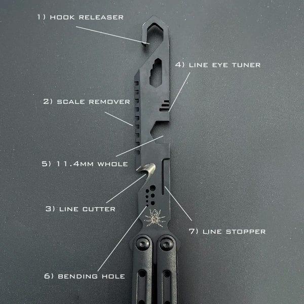 The Little Jack Butterfly Fishing Tool is a high-quality 7-in-1 tool that offers everything an angler needs (and more!) for a day on the water. Designed and manufactured by renowned Japanese lure makers Little Jack, the Butterfly Fishing Tool will simplify your loadout by combining all your tools into one compact package that is easy to carry and use. Featuring some must-have functions, such as a hook release and line cutter, and some things you probably didn’t even think to pack, like a line stopper (for tying leader lines) or bending holes (to reshape bent-out hooks!).