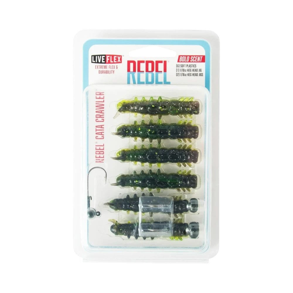 Designed to mimic a caterpillar, a common meal for many species of freshwater fish, the Rebel Liveflex Cata Crawler has been engineered to offer wary or pressured fish a new level of realism. With its small segmented body and micro appendages that vibrate on the fall, the Cata Crawler calls curious and hungry fish in with its lifelike appeal and movements. Made from Rebel’s LiveFlex elastomer soft plastic, this bait is highly durable, buoyant, and features a proprietary scent infusion that turns otherwise timid fish into aggressive hunters. Perfect for use as a Ned Rig worm, the Cata Crawler will maintain an upright posture thanks to the floating properties of the LiveFlex soft plastic. Each pack comes with six soft baits, two pre-rigged on the Rebel 1/16oz Keg Head Jig, and an additional 1/10oz Keg Head jig for use in deeper or faster-moving waters. Available in a variety of detailed and realistic color options and coming in at only 2″ in length, the Cata Crawler is the perfect snack for bass, trout, panfish, crappie, and more.