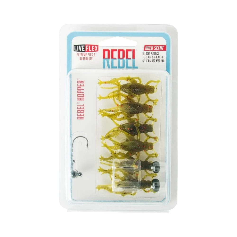 With its highly detailed body, the Rebel Liveflex Hopper is a perfect mimic of a grasshopper or cricket that has fallen into the water. Designed to be used with the Rebel Keg Head Jig Heads, the Hopper can be dragged, hopped, or swum through the water as a tasty offering for nearly any species of fish. Made from Rebel’s Liveflex elastomer soft plastic, the Hopper is ultra-durable and buoyant, ensuring it will stand up on the bottom and can withstand dozens of catches without tearing. This small insect is also infused with a proprietary blend of scents that will turn timid nibbles into aggressive strikes and will keep the fish hanging on for longer, allowing ample time for anglers to set the hook. With carefully designed details, such as antennae, tail appendages, leg spines, and claws, Hopper offers a level of realism that most fish have never seen in a bait. Each kit comes with six soft plastic Hopper baits, two pre-rigged on a 1/16oz Rebel Keg Head Jig, and one additional 1/10oz jig for fishing in deeper or faster-moving waters. The Rebel LiveFlex Hopper is available in several realistic colorways and is sized just right to catch bluegill, bass, trout, or any other fish looking for an easy meal in shallow creeks, ponds, and streams.