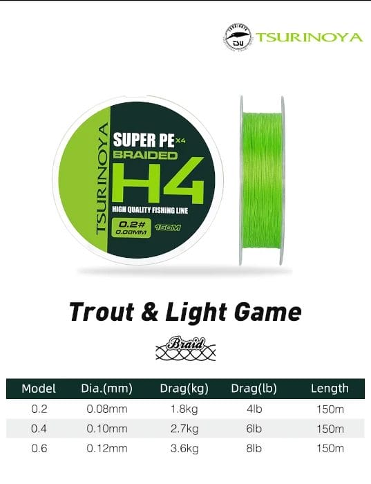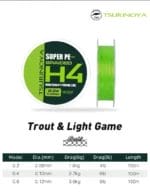 Designed for ultra-finesse spin and bait finesse anglers, Tsurinoya Braided H4 Super Pe Line provides excellent castability and strength with an ultra-thin diameter. Weaved using premium spec materials using a 4stand H pattern, H4 Super PE Line has a uniformly smooth line diameter and suppleness for excellent casting characteristics with increased distances. An ultra-smooth coating is applied to provide added abrasion resistance, increased knot strength, and hydrophobicity to maintain the line’s toughness. A premium spec dye is applied via injection for a longer-lasting brightness that holds fast even when exposed to the elements, and the fluorescent green colorway allows for excellent line visibility in all conditions.