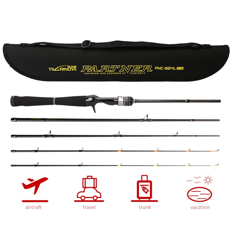 The Partner Series Rods from Tsurinoya are packed with features for the angler on the go. Designed as travel rods, the Partner Series Rods feature a 4-piece blank, making them compact when broken down and stored in the included rod case. Included are two color-coded rod tips, a standard tubular rod tip (orange guide wraps), and a solid carbon rod tip (chartreuse guide wraps), allowing you to change the rod’s action on the fly. When equipped with the tubular rod tip, the Partner Series Rods offer more power and a smooth action allowing for easy control and landing of fish. The lightweight casting ability and sensitivity are enhanced when paired with the solid carbon rod tip, allowing for a more finesse presentation and easy bite detection. Equipped with stainless steel Fuji guides, a Fuji reel seat, and an EVA handle, the Partner Series Rods are suited for use in freshwater and saltwater conditions.