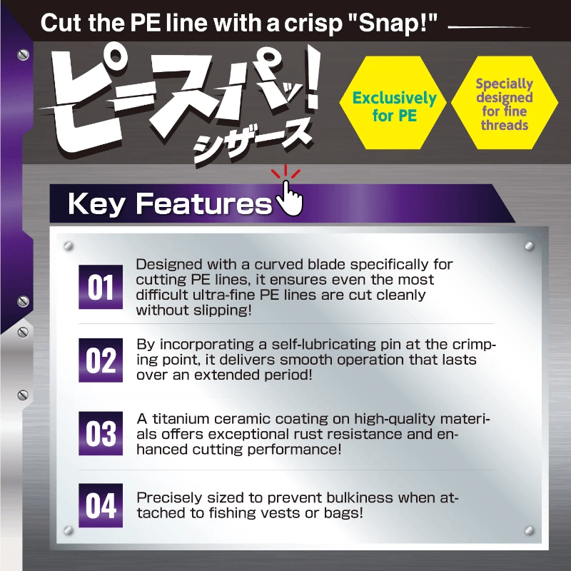 Developed by VAIRVAS’s in-house experts, PE-SUPA’s blades are meticulously crafted from high-grade stainless steel and feature a titanium ceramic coating that provides outstanding corrosion resistance and cutting efficiency. The curved blade design is optimized to handle the thinnest PE lines without slipping or fraying, thereby enhancing knot hold and line integrity. PE-SUPA Scissors are built with a self-lubricating pivot pin, ensuring long-term smoothness in operability and increased durability. Comfortable ABS resin handles provide a firm grip, even in cold and wet conditions. These compact scissors easily stow away in a tackle bag or vest pocket and feature a handy hole for compatibility with most lanyard clips. Dependable on and off the water, the VARIVAS PE-SUPA Scissors are an outstanding asset for any serious angler who demands the best tools available.